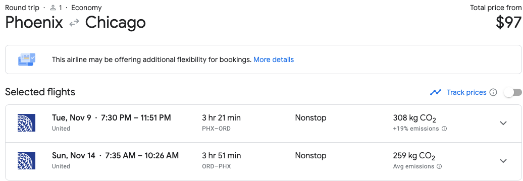 Another extremely low fare in this deal is flying the almost 1,500 miles from Phoenix to Chicago on Nov. 1 and returning on Nov. 6, including this flight for less than $100 on United.