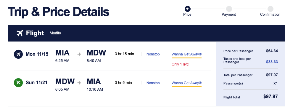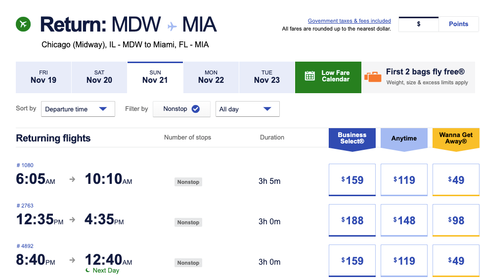For example, you could fly SWA from Miami (MIA) to MDW on Nov. 15 and return on Nov. 21 for just $49 each way, with flight selections outlined below.