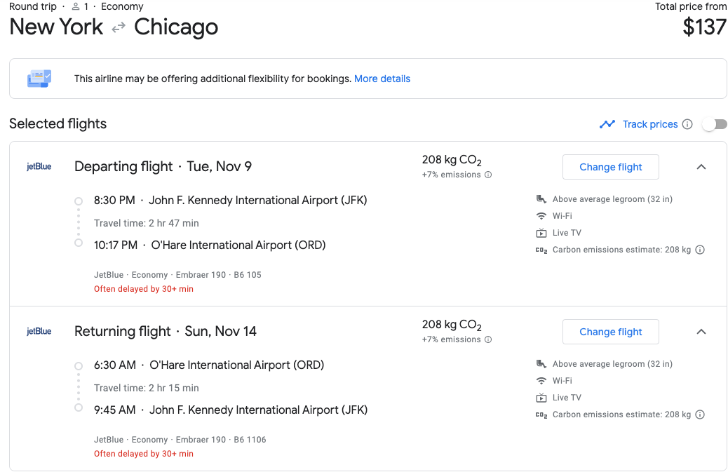 To search for flights within this deal, head to Google Flights and enter your departure city of choice and Chicago (ORD) in the "Where to?" box. Let's start with this nonstop JetBlue flight out of JFK to ORD in early November for $137 round-trip.