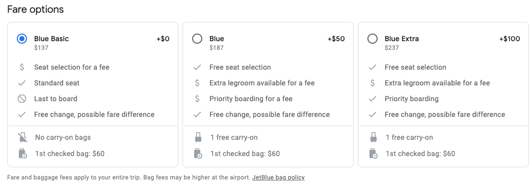 Although it matches the $137 price advertised in the deal, this flight would actually end up costing an additional $60 to carry on a bag because JetBlue's Blue Basic fare does not include carry-on luggage. Alternatively, you could pay $50 more to upgrade to their Blue fare which includes one free carry-on for a fare totaling $187.