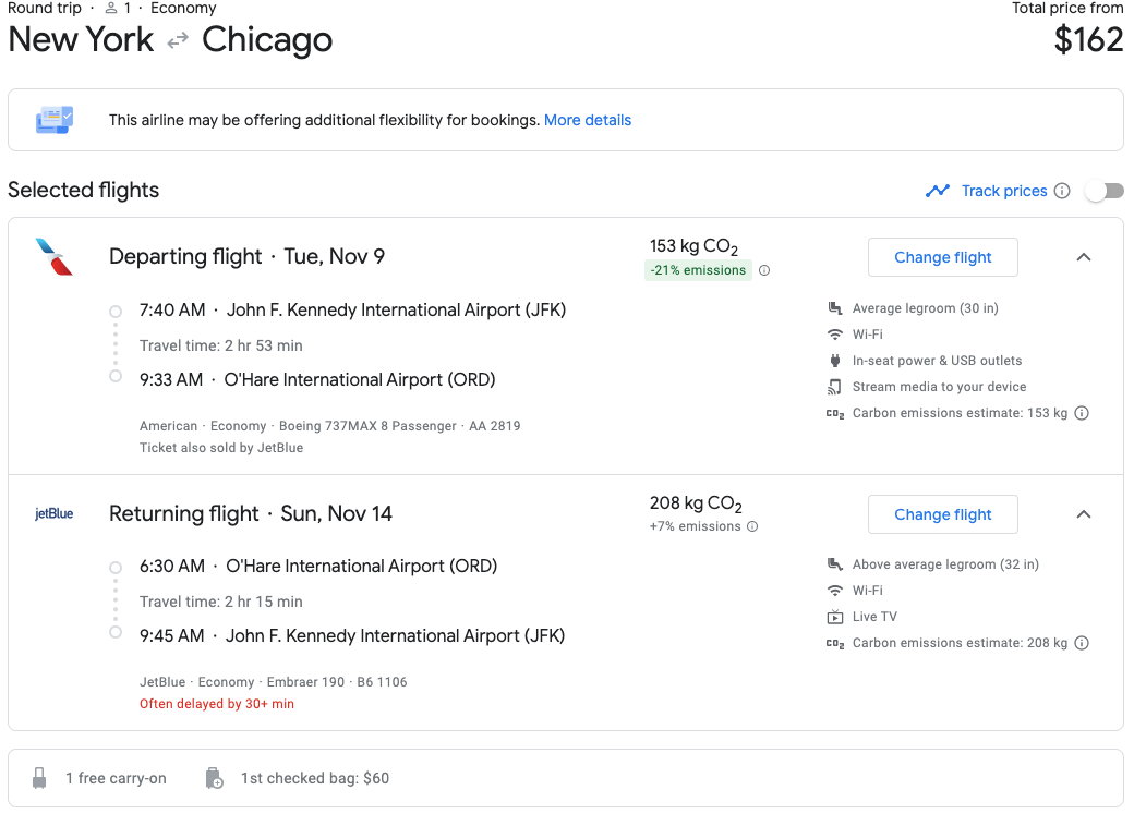 You could also evade JetBlue's baggage fees by paying a bit more to fly American to Chicago on Nov. 9 and JetBlue on the way back on Nov. 14, such as the below flight.