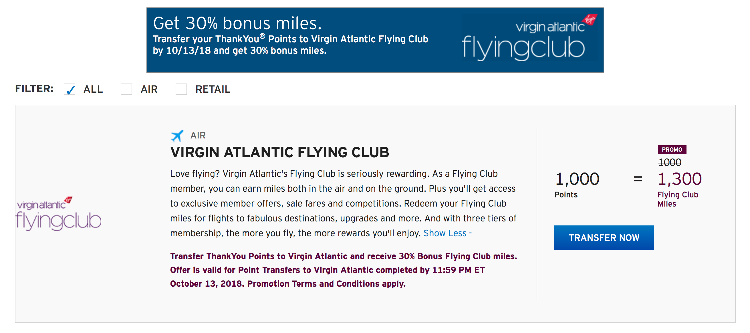 If you've got a surplus of Citi ThankYou points and have been eyeing a redemption through Virgin Atlantic, you could be in luck. For a limited time, the Citi ThankYou program is offering a 30% transfer bonus to the Virgin Atlantic Flying Club program.