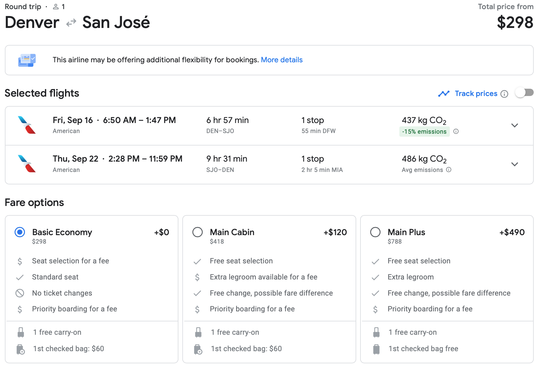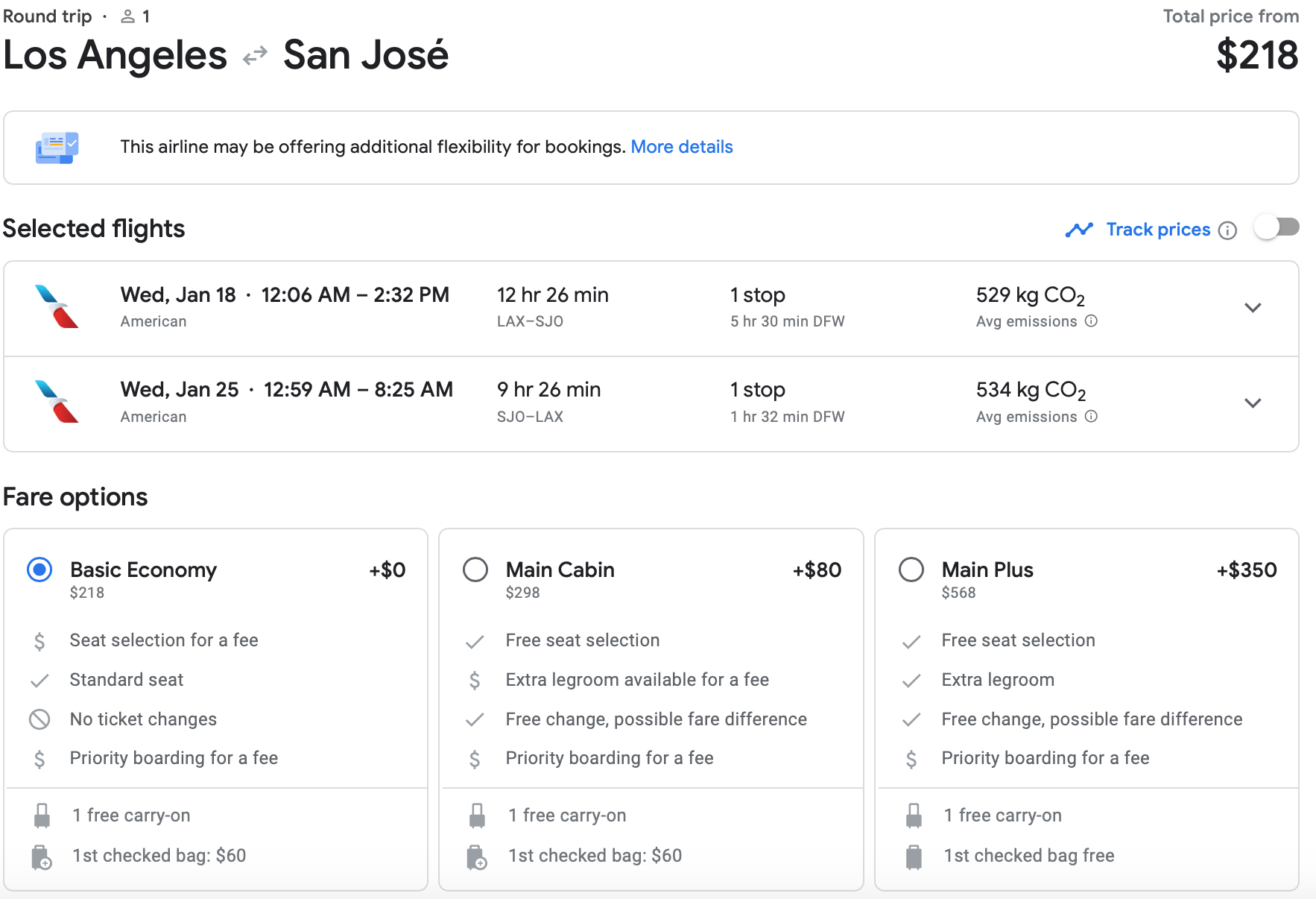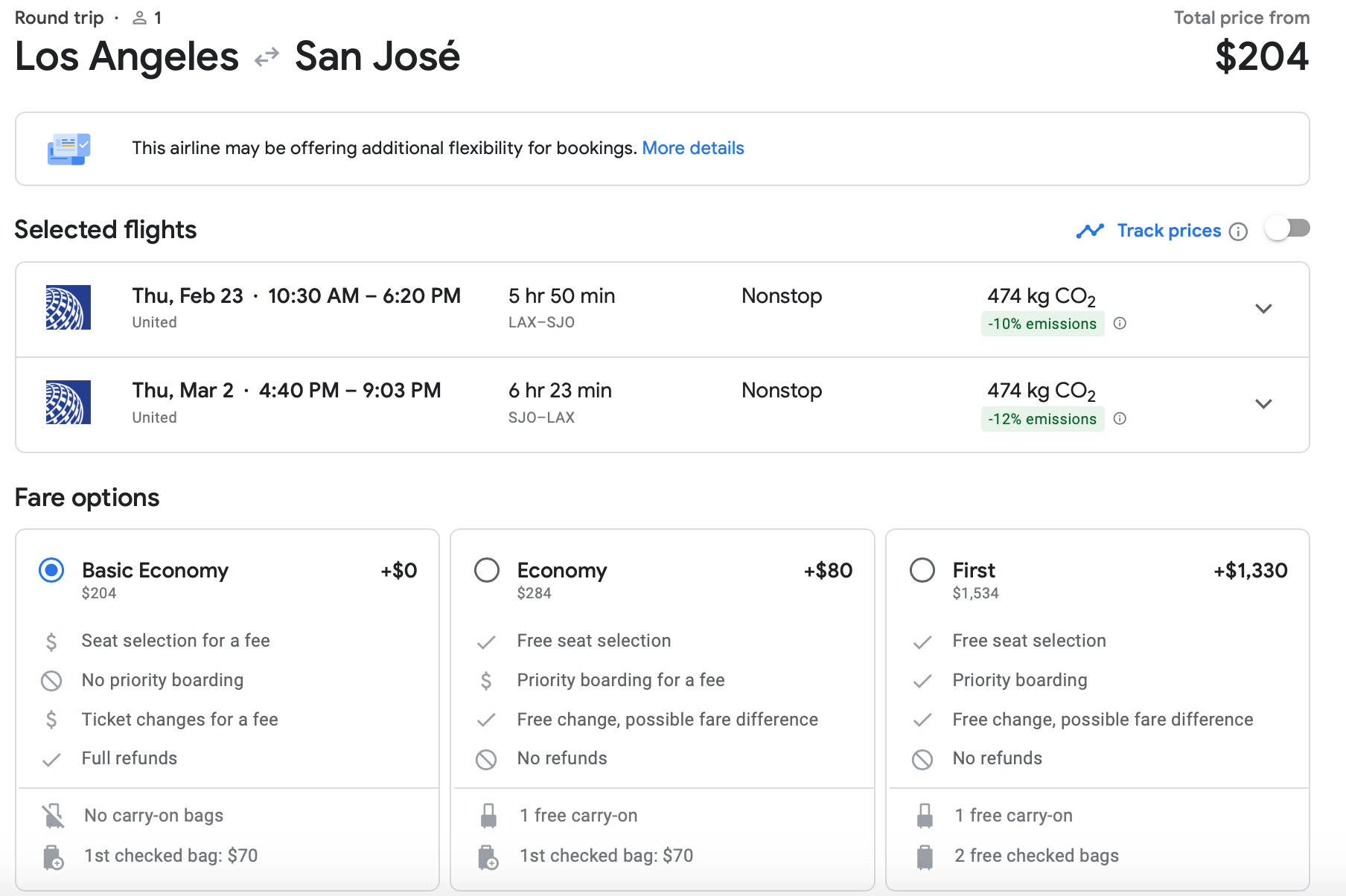 There are lots of flights available from Los Angeles (LAX) to San Jose. In fact, the further out you can plan your travel, the cheaper the tickets get. We found this itinerary in late February on United for only $204 for a nonstop. It's basic economy so you'll have to pay to upgrade for a free full-size carry-on, but at this low price, it's worth doing so.