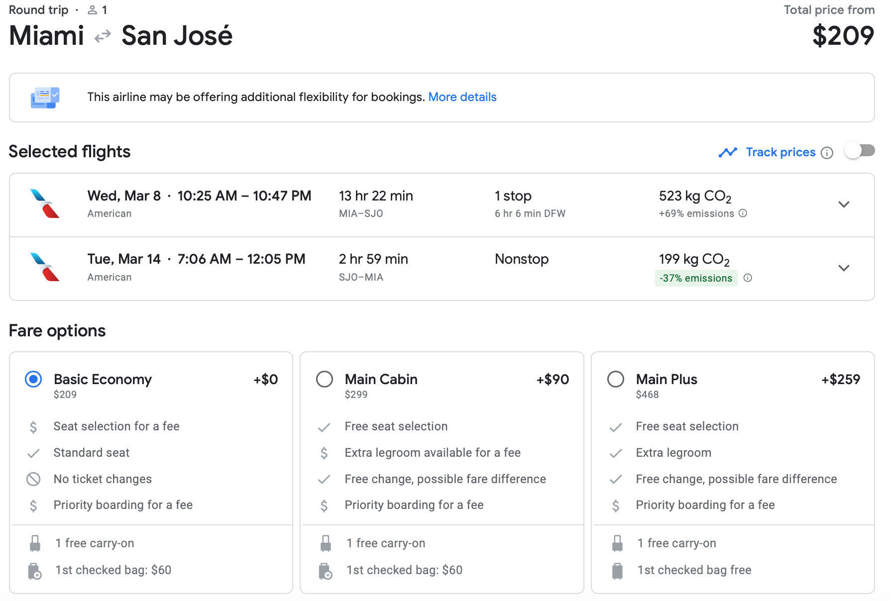 If you live in Miami, you have a wide range of fares to choose from. This route on American in March is only $209 round trip, and it includes a nonstop return flight. We found similar prices for several flights from Miami International Airport (MIA) to San Jose in February.
