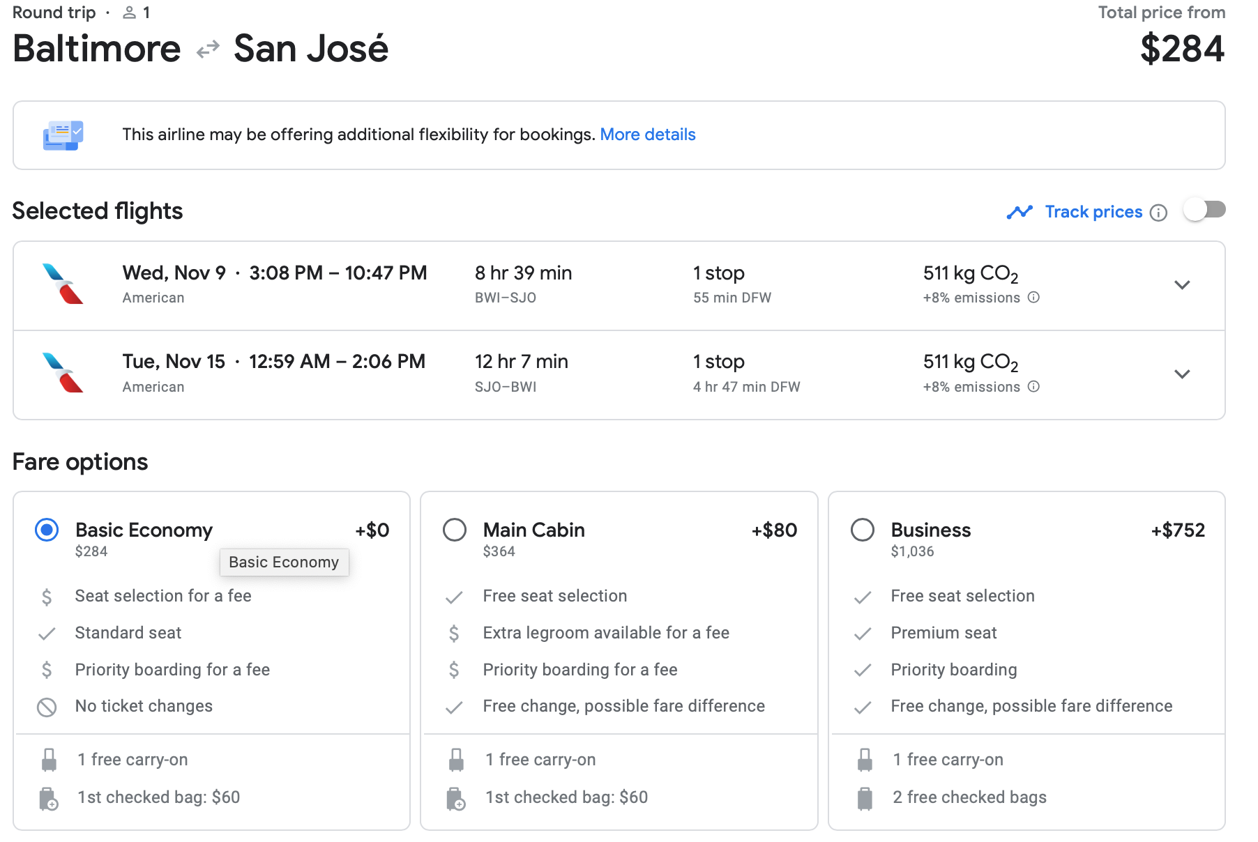 Baltimore (BWI) to San Jose can be booked for as low as $284 round-trip, with a layover each way, on American in November and December. Keep in mind that many of the lowest prices we saw for this route in December involved flights with two stops.