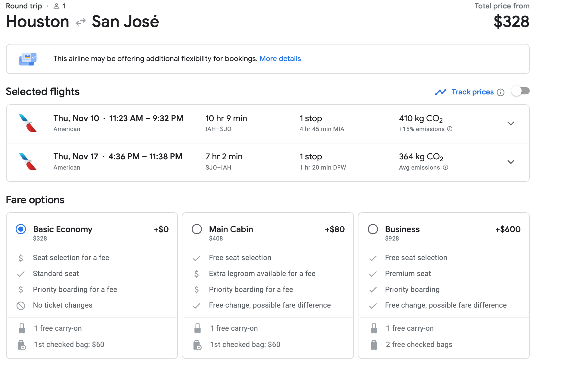 You can find discounted flights to San Jose from both Houston Airports. This November ticket from George Bush Intercontinental Airport (IAH) costs just $328, a nice discount from the usual price for that time of year.