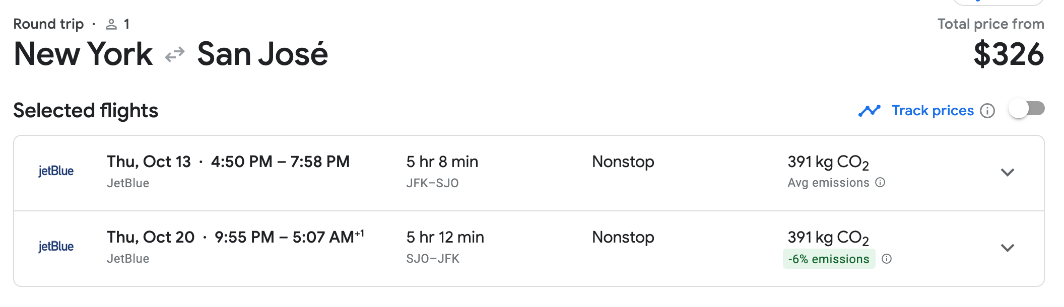 To search this deal, head to Google Flights and enter your origin city and put SJO as your destination. For example, you could book a round-trip, nonstop flight from JFK to SJO in mid-October for $326 on JetBlue.