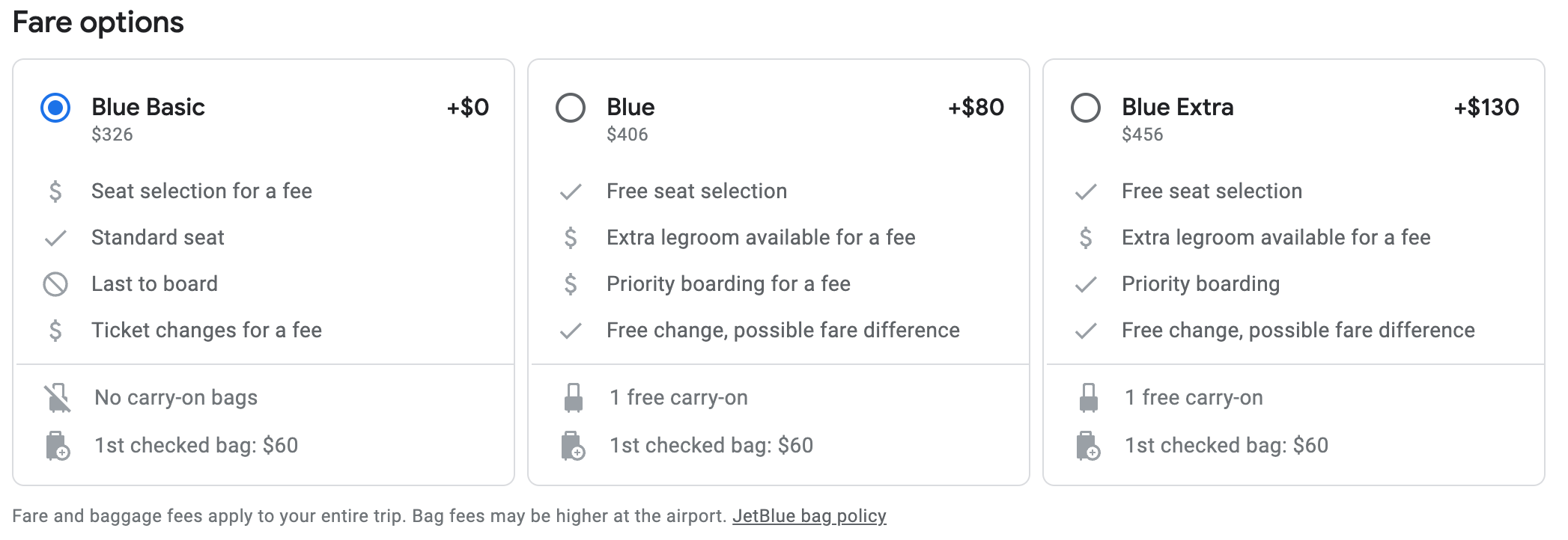 Unless you can fit all your swimsuits, jungle gear and toiletries in a small stowaway bag, you'll need to pay extra for baggage since the JetBlue flights are for the carrier's Blue Basic fare, which only allows travelers to bring one personal item that can fit under the seat in front of them on board. Any full-size carry-on bag brought to the gate will need to be checked for $60.