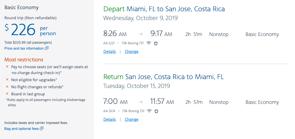 Miami (MIA) to San Jose (SJO) for $226 round-trip on American: