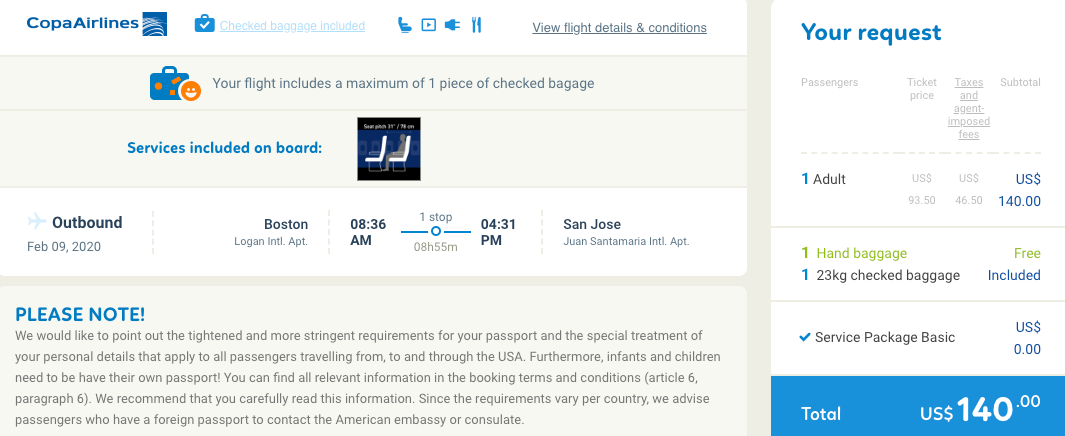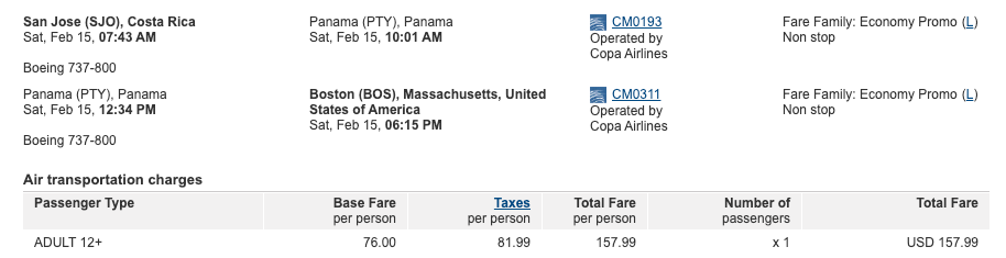 Boston (BOS) to San Jose (SJO) for $298 round-trip when booked separately on Copa via Vayama and on Copa: