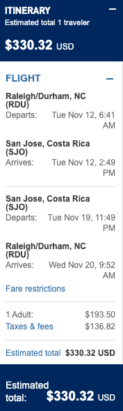 Raleigh (RDU) to San Jose (SJO) for $330 round-trip on JetBlue: