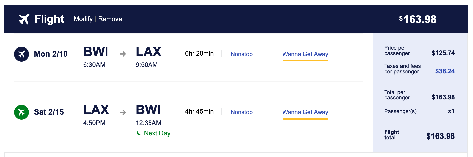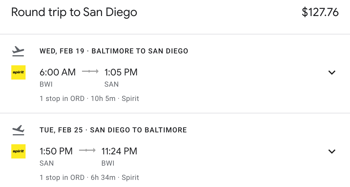 Baltimore (BWI) to San Diego (LAX) round-trip on Spirit via Google for $128: