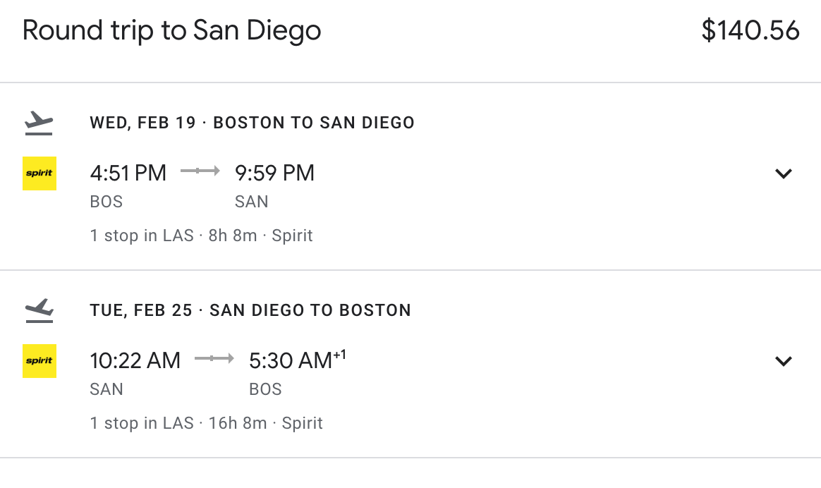 Boston (BOS) to San Diego (SAN) round-trip on Spirit via Google for $141: