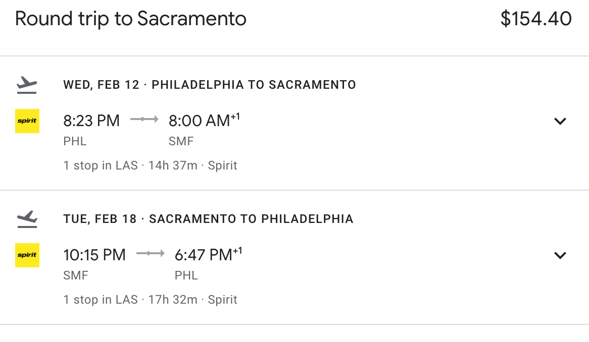 Philadelphia (PHL) to Sacramento (SMF) round-trip on Spirit via Google for $154: