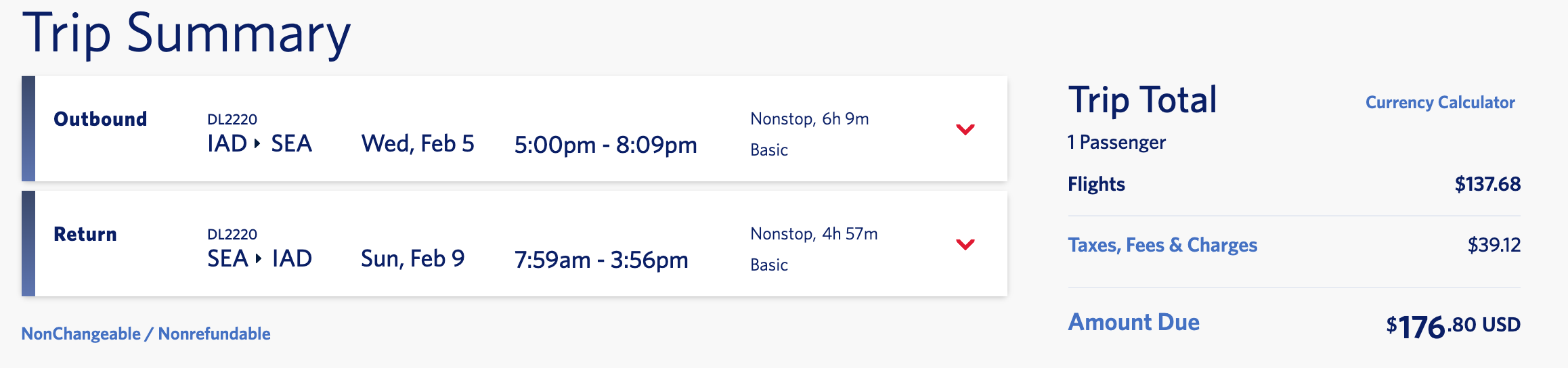 Washington, D.C. (IAD) to Seattle (SEA) round-trip on Delta basic economy for $177: