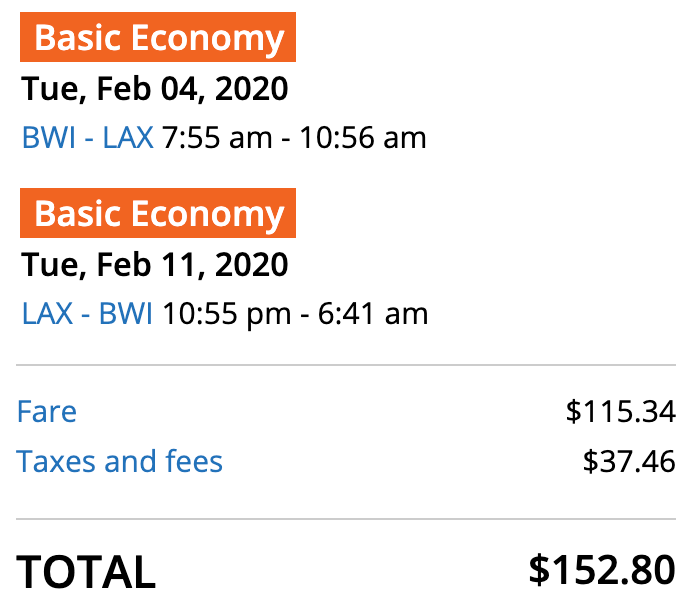 Baltimore (BWI) to Los Angeles (LAX) round-trip on United basic economy for $153: