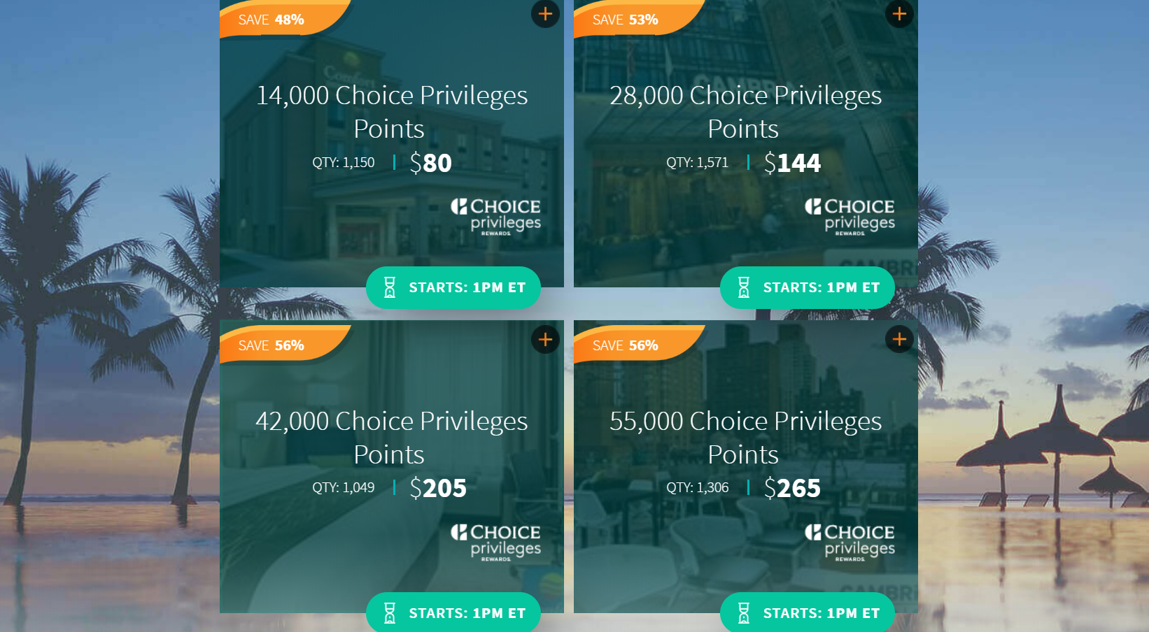 But, there's one day that many of us have had circled on our calendars: May 15 -- the day that Choice Privileges points would go on sale at up to 56% off. And now, today's the day! At 1pm ET, you can buy packages of Choice points at a rate starting at just 0.48 cents per point. In total, there's almost 176 million Choice points up for grabs. And, based on how quickly Choice points sell through Daily Getaways, these will all be sold out within an hour.