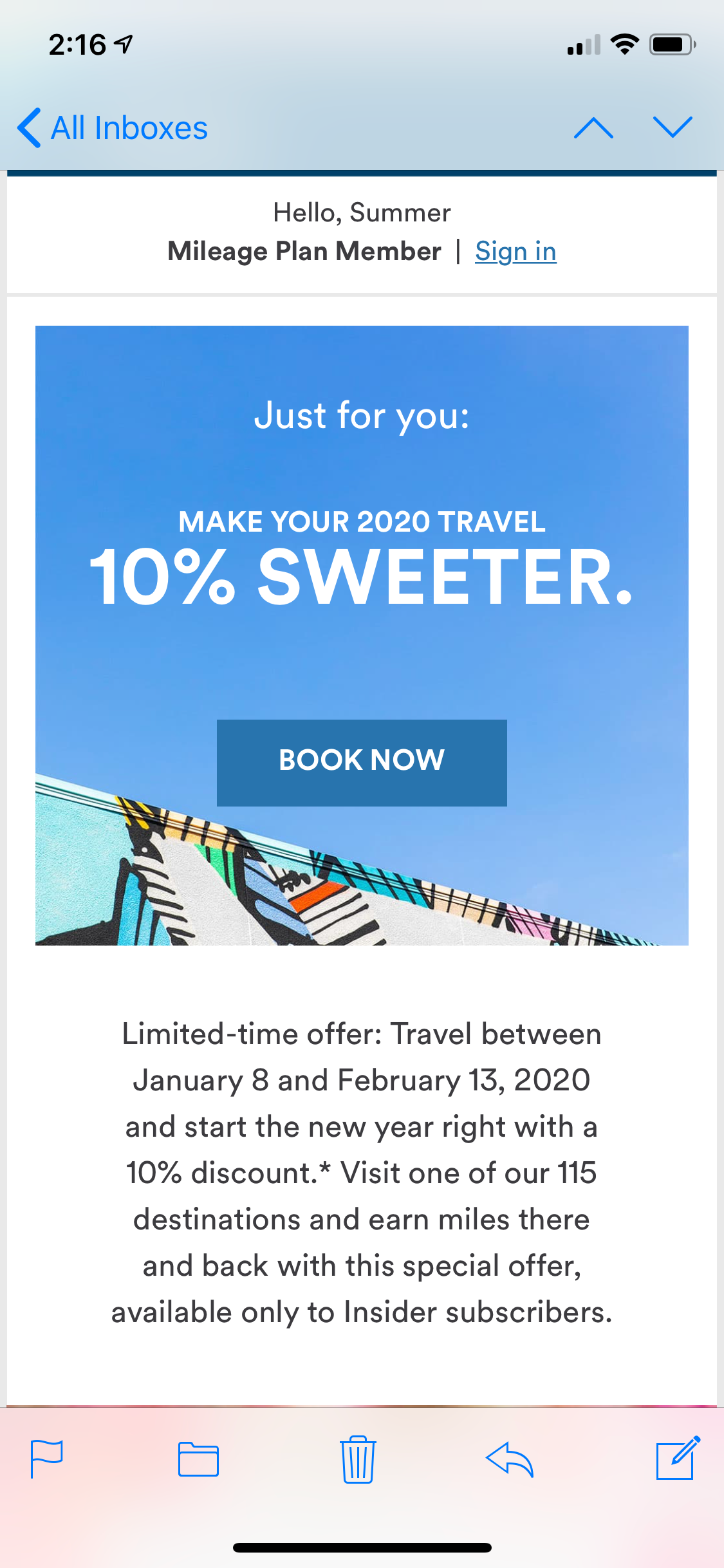 Alaska has a little sugar for its email subscribers: a unique discount code for 10% off travel between January 8 and February 13, 2020.