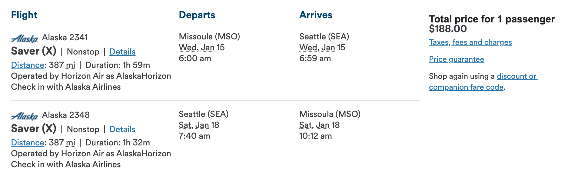 Missoula (MSO) to Seattle (SEA) for $188 round-trip nonstop: