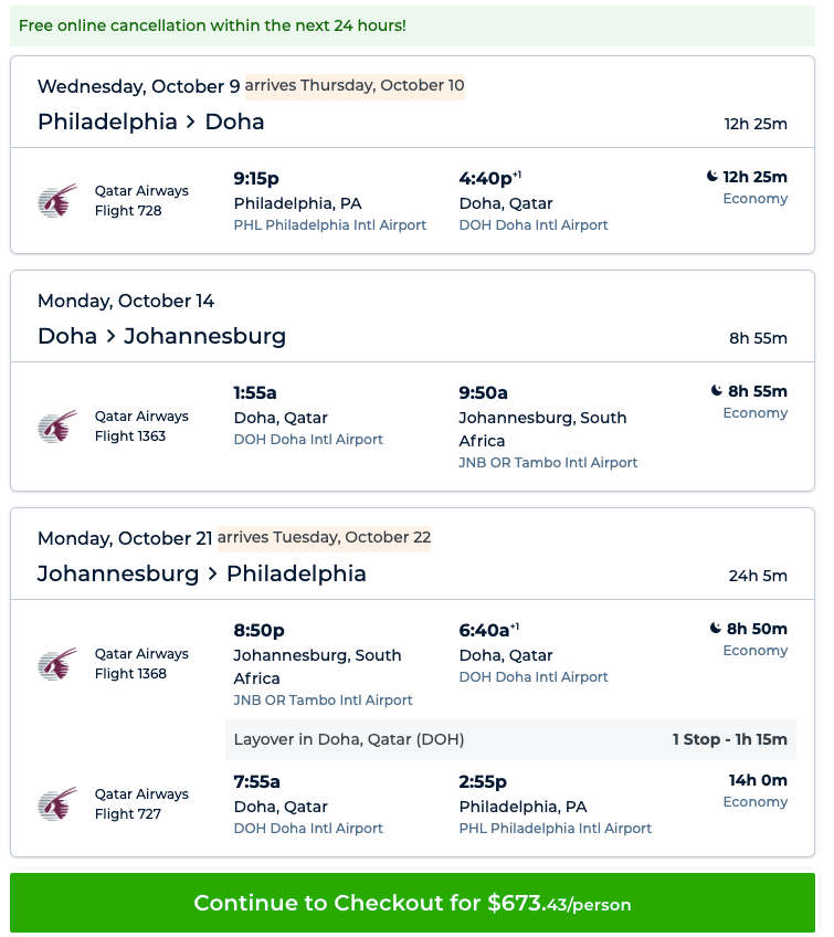 Philadelphia (PHL) to Doha (DOH) to Johannesburg (JNB) for $674 round-trip nonstop on Qatar Airways via Priceline: