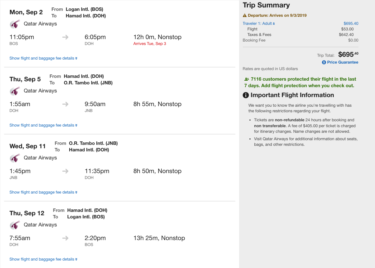 Boston (BOS) to Doha (DOH) to Johannesburg (JNB) for $695 round-trip nonstop on Qatar Airways via Orbitz: