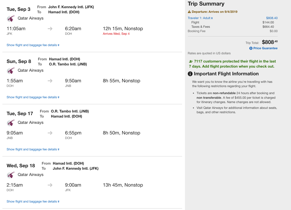 New York City (JFK) to Doha (DOH) to Johannesburg (JNB) for $809 round-trip nonstop on Qatar Airways via Orbitz:
