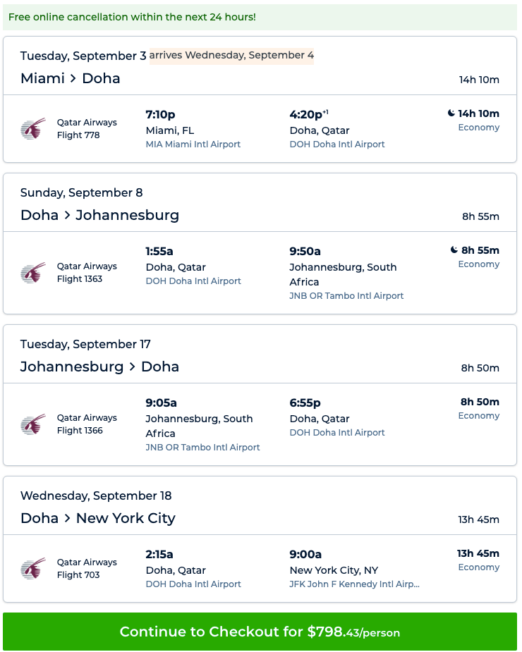Miami (MIA) to Doha (DOH) to Johannesburg (JNB) for $799 round-trip nonstop on Qatar Airways via Priceline:
