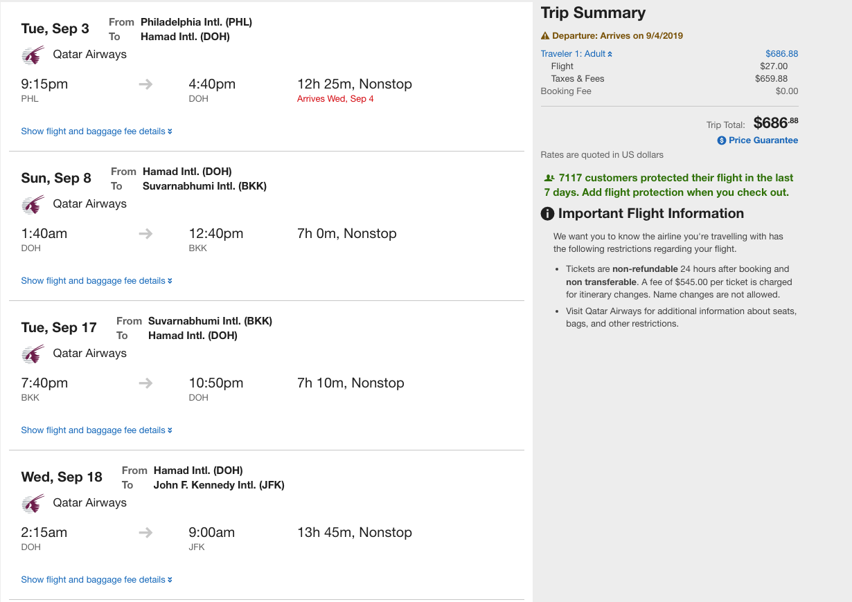 Philadelphia (PHL) to Doha (DOH) to Bangkok (BKK) for $687 round-trip nonstop on Qatar Airways via Orbitz: