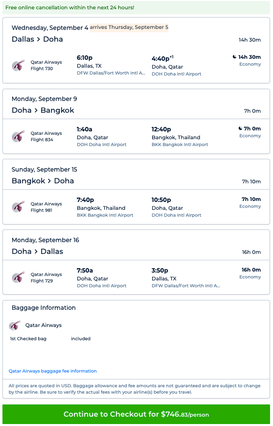 For example, you can travel from Chicago to Bangkok round-trip with a 3-day stopover in Doha for just $719 in September. All flights are nonstops on Qatar Airways. Deals are only available from US cities served by Qatar Airways. Cheap flights are available beginning in September with limited availability throughout October.