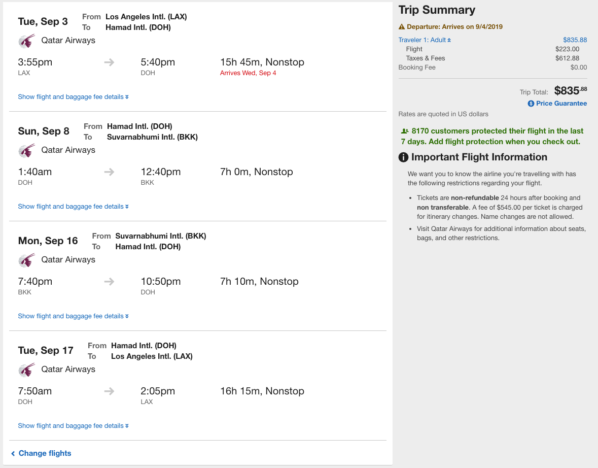 Los Angeles (LAX) to Doha (DOH) to Bangkok (BKK) for $836 round-trip nonstop on Qatar Airways via Orbitz: