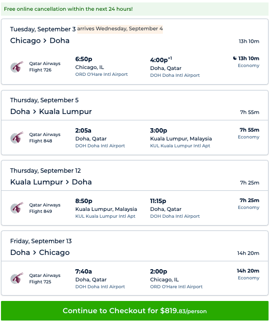 Chicago (ORD) to Doha (DOH) to Kuala Lumpur (KUL) for $820 round-trip nonstop on Qatar Airways via Priceline: