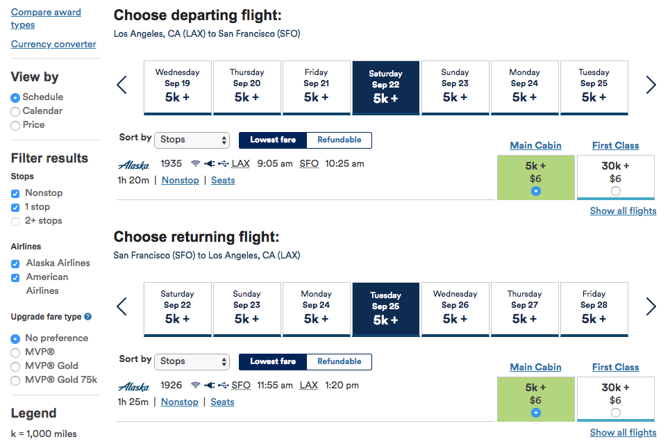 Los Angeles (LAX) to San Francisco (SFO) for 10,000 miles + $12 in taxes and fees round-trip in September: