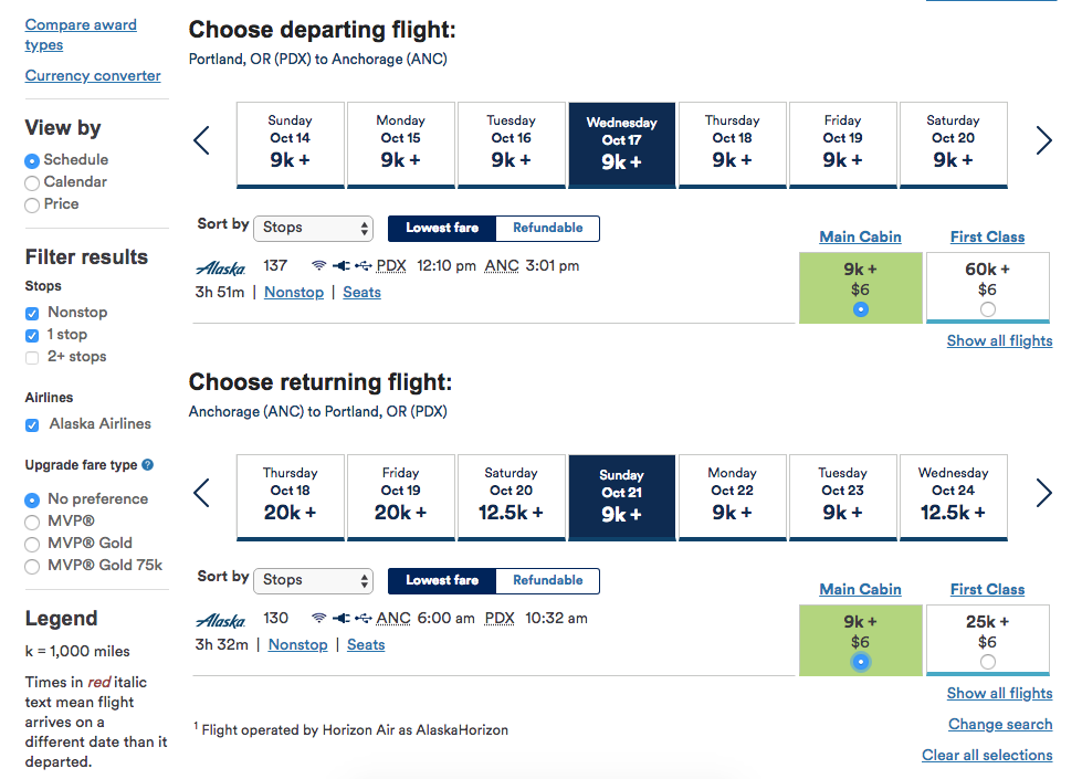 Portland (PDX) to Anchorage (ANC) for 18,000 miles + $12 in taxes and fees round-trip in October: