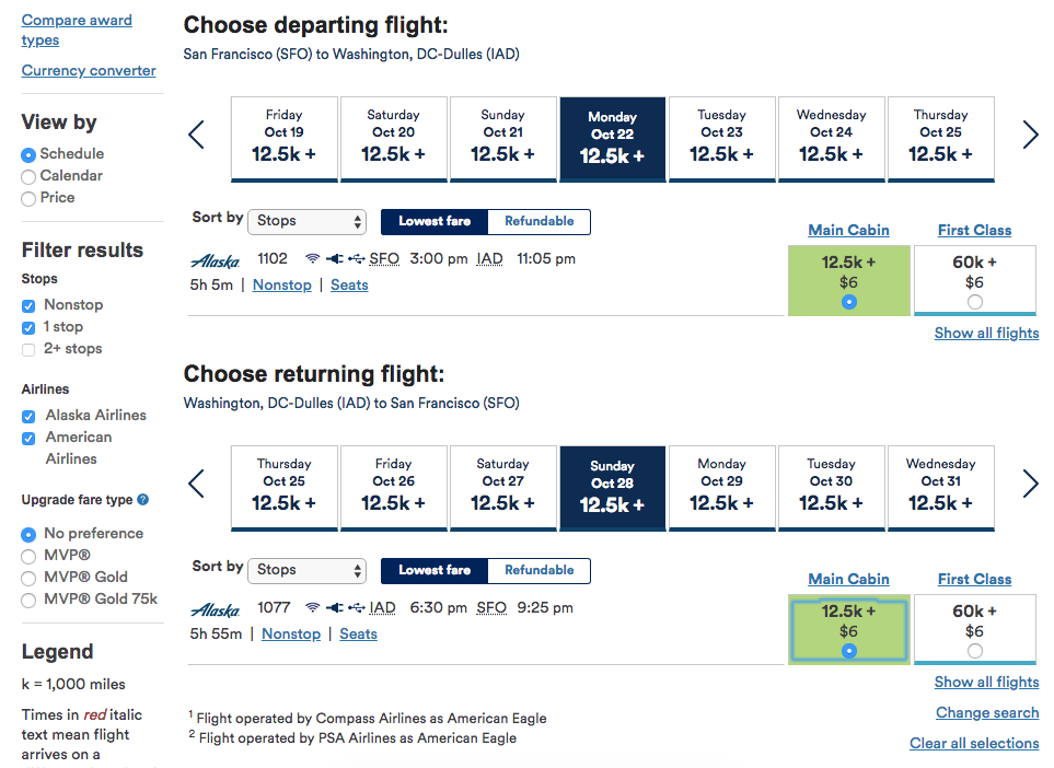 San Francisco (SFO) to Washington DC (IAD) for 25,000 miles + $12 in taxes and fees round-trip in October: