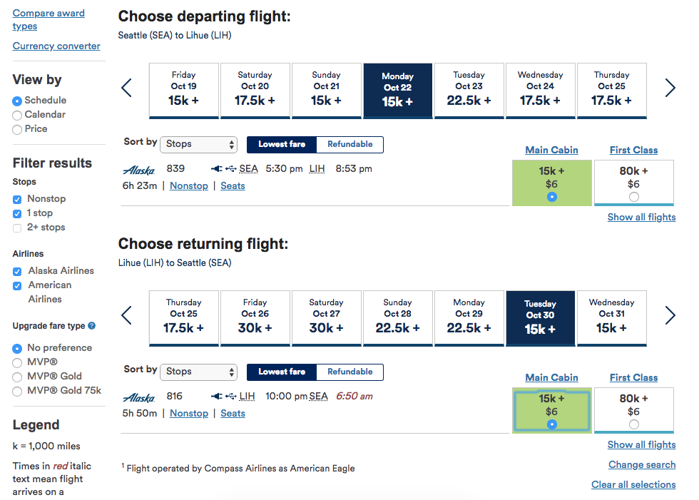 Seattle (SEA) to Kauai (LIH) for 30,000 miles + $12 in taxes and fees round-trip in October: