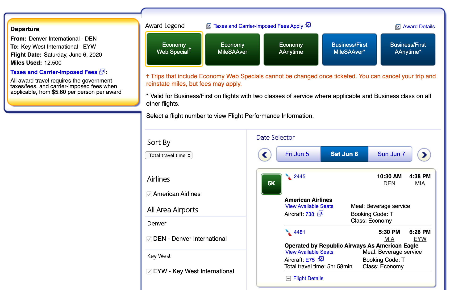 Denver (DEN) to Key West (EYW) for 5,000 AA miles + $5.60 one-way: