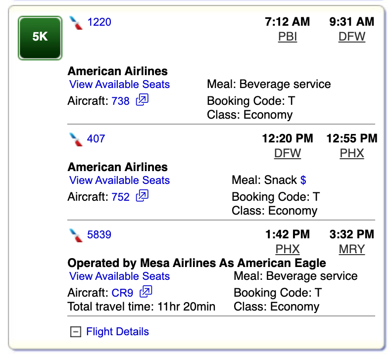 (PBI) to Carmel/Monterey, California (MRY) for 5,000 AA miles + $5.60 one-way:
