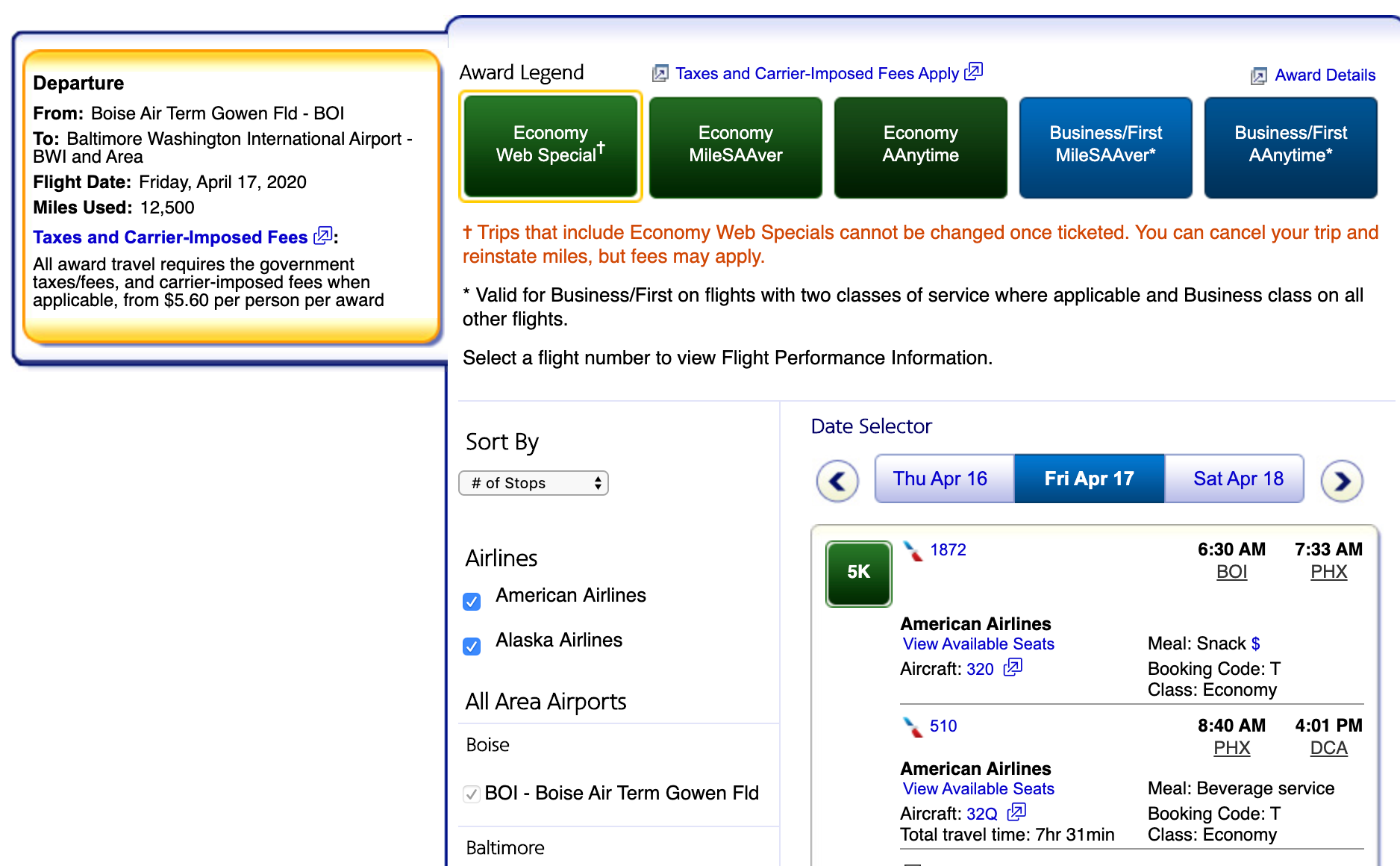 Boise (BOI) to Washington, D.C. (DCA) for 5,000 AA miles + $5.60 one-way: