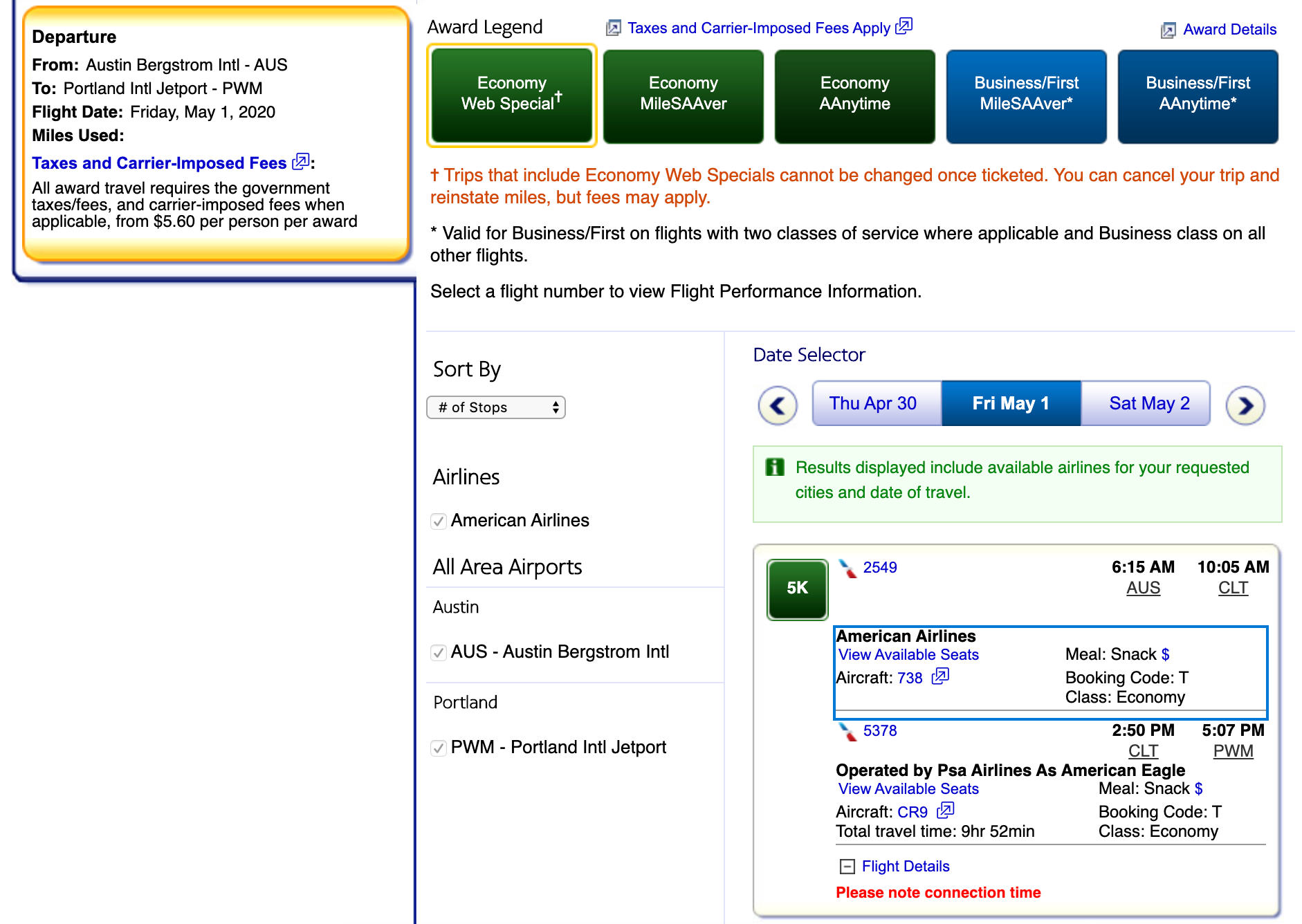 Austin (AUS) to Portland, Maine (PWM) for 5,000 AA miles + $5.60 one-way: