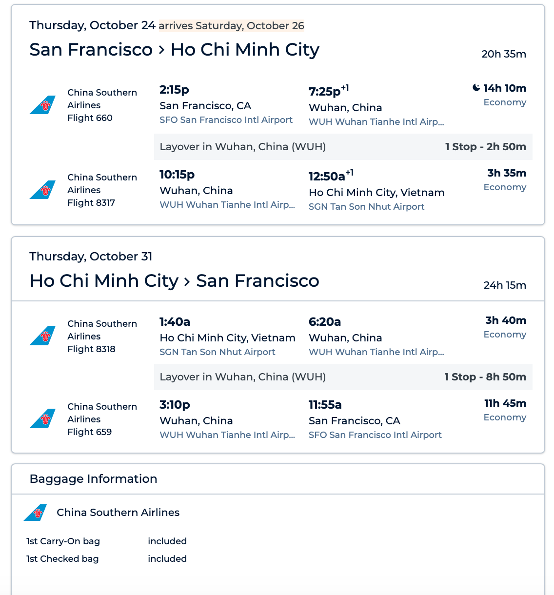 San Francisco (SFO) to Ho Chi Minh (SGN) for $458 round-trip on China Southern via Priceline: