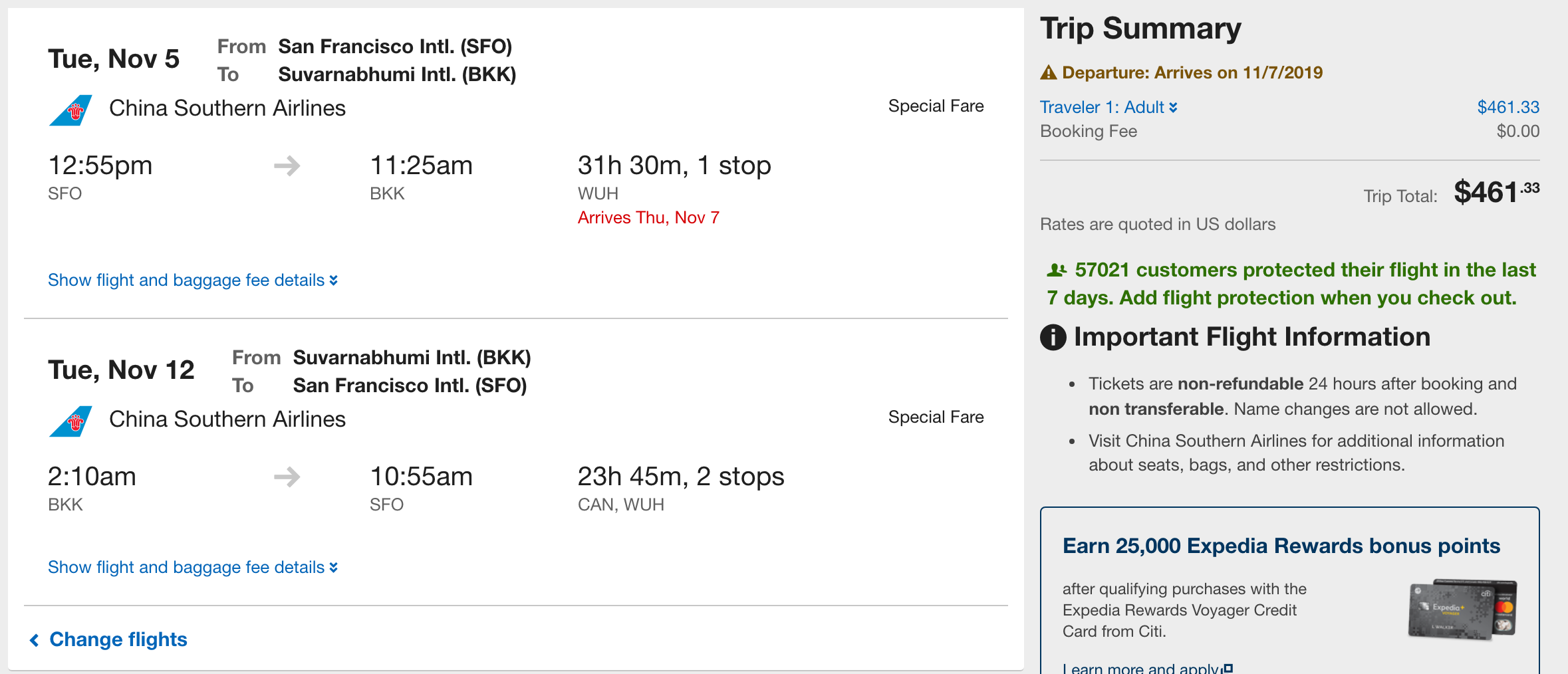San Francisco (SFO) to Bangkok (BKK) for $462 round-trip on China Southern via Expedia: