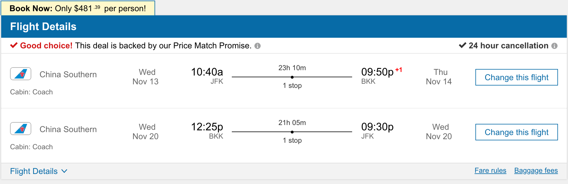 New York City (JFK) to Bangkok (BKK) for $482 round-trip on China Southern via Cheap-o-air: