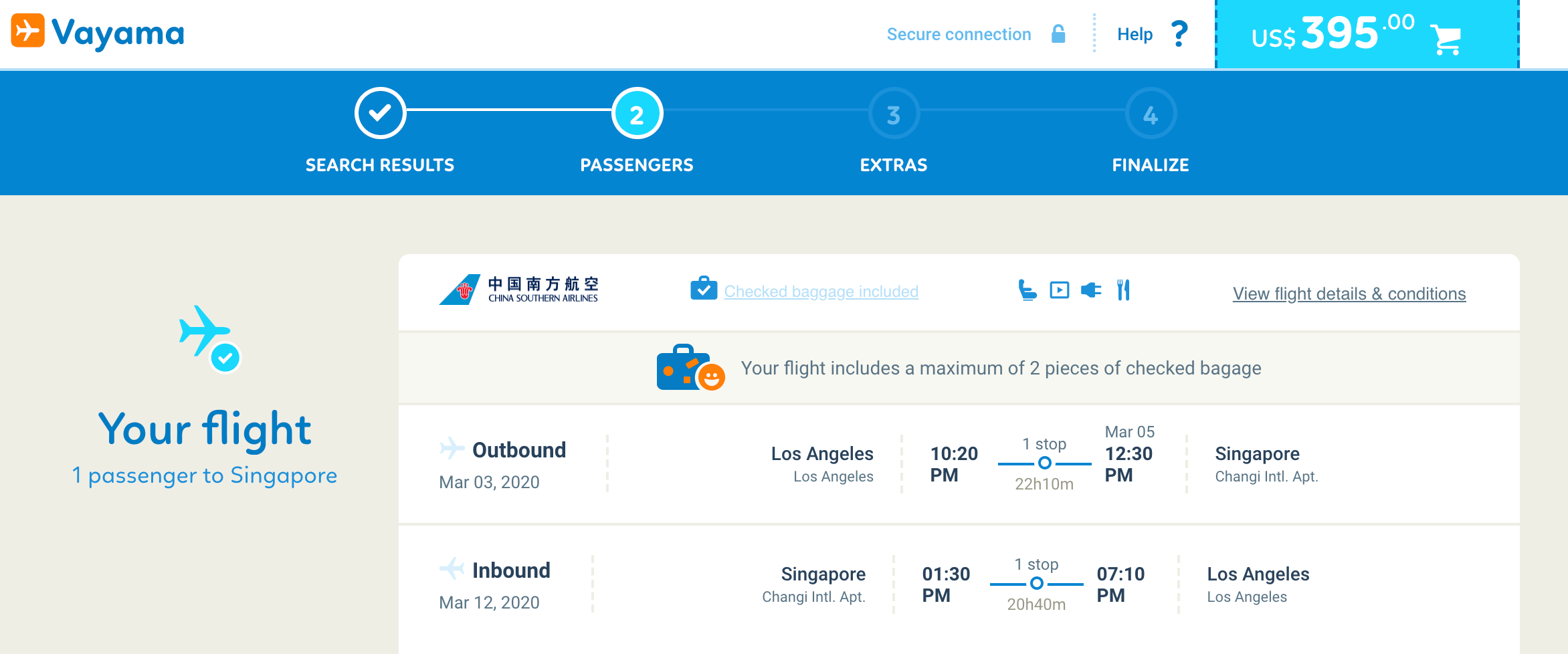 Los Angeles (LAX) to Singapore (SIN) for $395 round-trip on China Southern via Vayama: