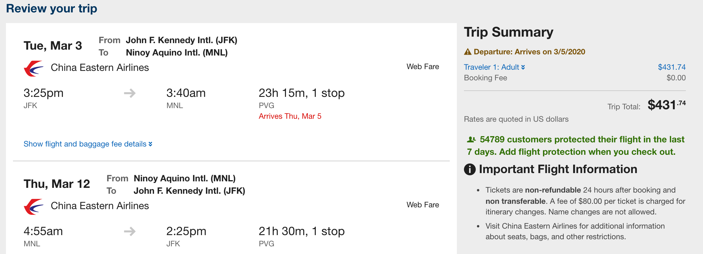 New York (JFK) to Manila (MNL) for $432 round-trip on China Eastern via Expedia:
