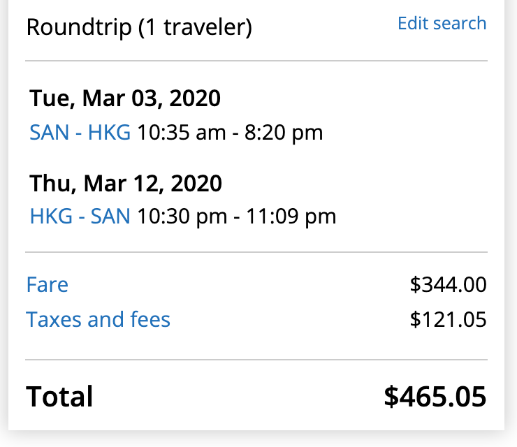 San Diego (SAN) to Hong Kong (HKG) on United for $465: