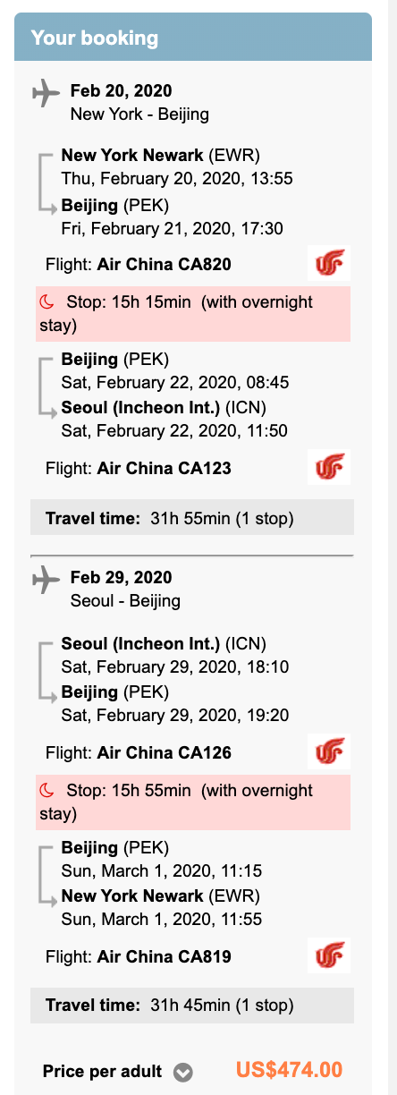 New York/Newark (EWR) to Seoul (ICN) round-trip for $474 on Air China via Gotogate: