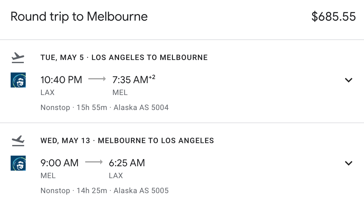 Los Angeles (LAX) to Melbourne (MEL) for $686 round-trip nonstop on Alaska/Qantas/American via Google: