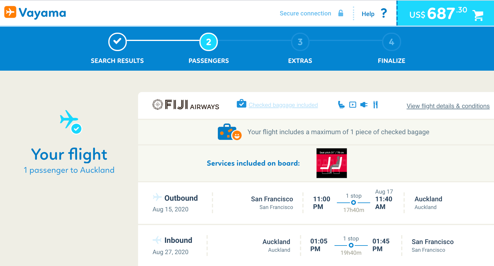 San Francisco (SFO) to Auckland (AKL) for $688 round-trip on Fiji via Google: