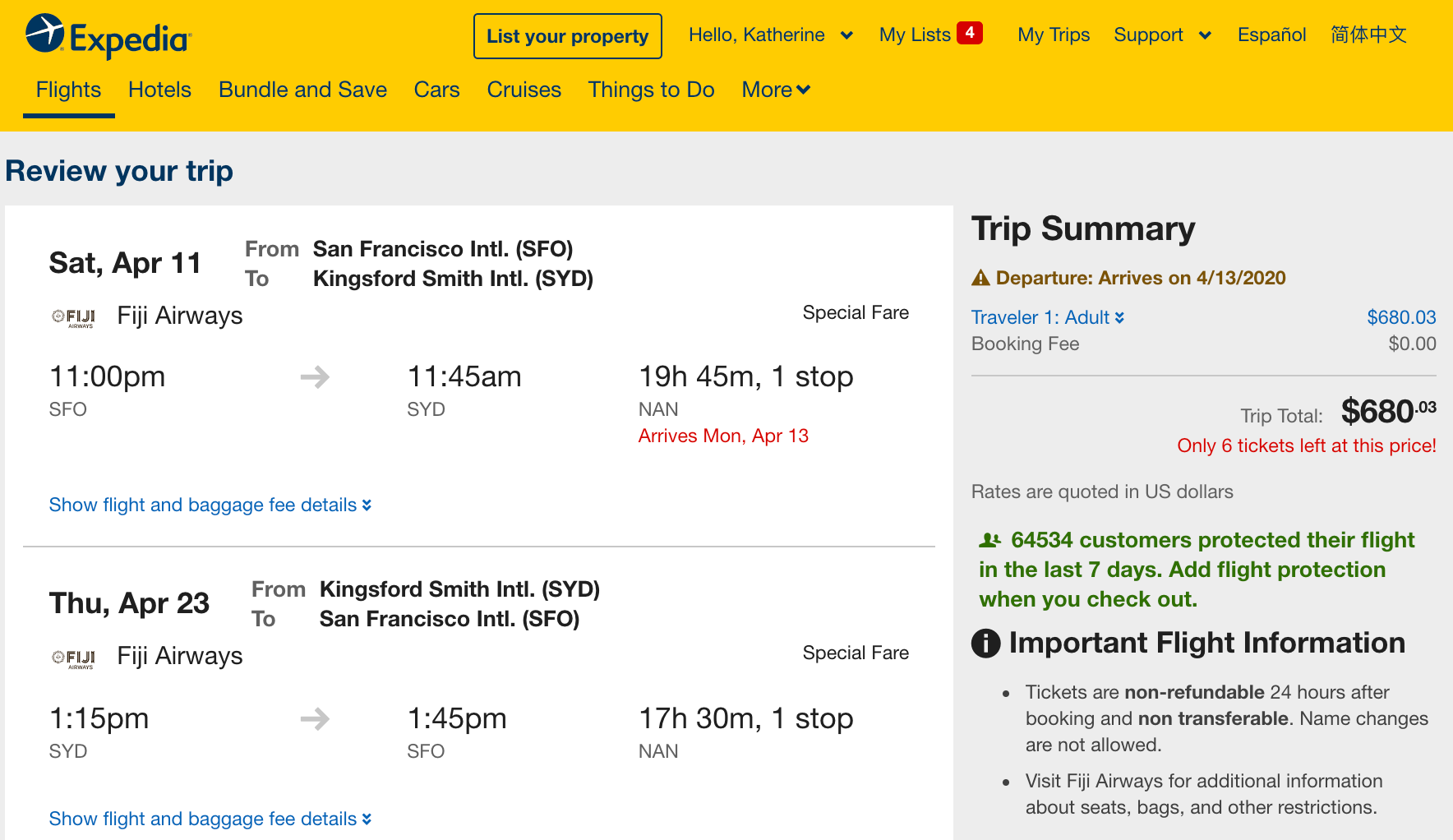 San Francisco (SFO) to Sydney (SYD) for $680 round-trip on Fiji Airways via Expedia: