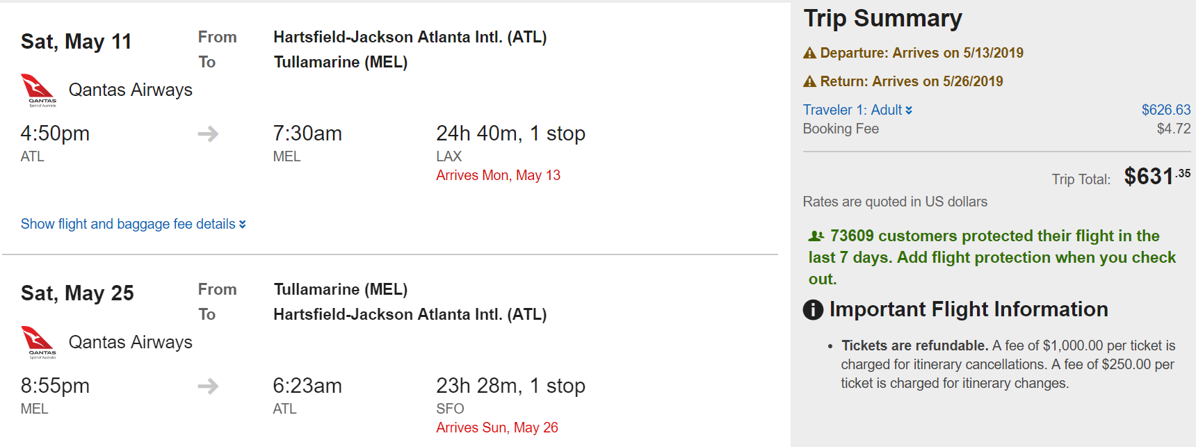 Atlanta (ATL) to Melbourne (MEL) for $631 round-trip on American/Qantas: